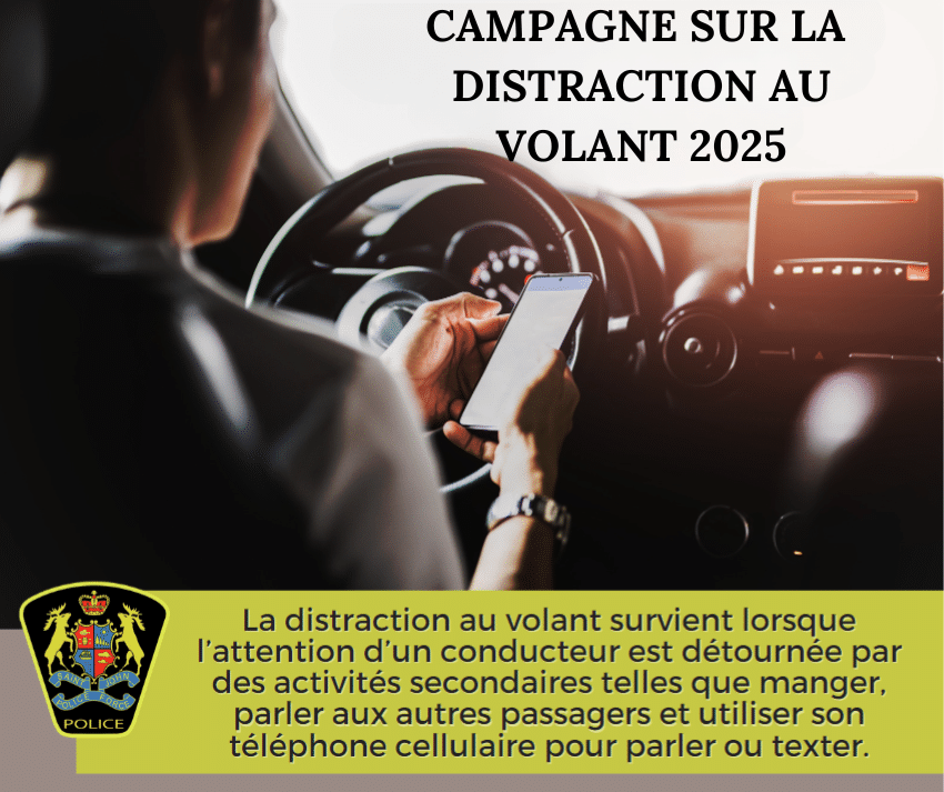La police de Saint John mènera une campagne contre la distraction au volant entre le 9 et le 12 juin 2025. La campagne sera axée sur l’application de la législation relative à la distraction au volant et sur la sensibilisation du public aux dangers associés à la distraction au volant.