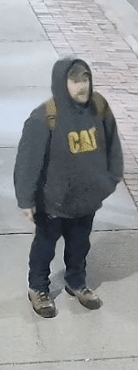 Suspect n° 2 : homme avec une barbichette portant un sweat à capuche gris avec les lettres jaunes « CAT » sur le devant, une casquette, un pantalon sombre, des bottes de travail brun et un sac à dos brun.