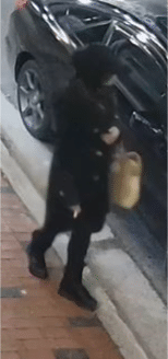 Suspect n° 3 : femme portant une casquette noire, un manteau noir avec une capuche, un pantalon noir, des chaussures noires et un sac à main beige.