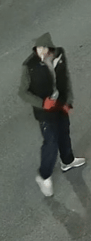 Suspect n° 1 : homme portant un sweat à capuche gris et un gilet noir, un jean bleu, des espadrilles blanches et grises, et des gants rouge/orange.